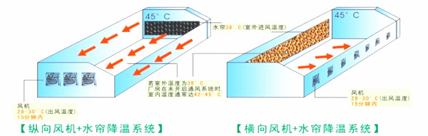 水帘降温是通过水蒸发降温:水帘运行时通过风机的协助,使外界高温的热空气通过水帘时,使水蒸发一部分,使水变成水蒸气带走部分热量,启到降温效。